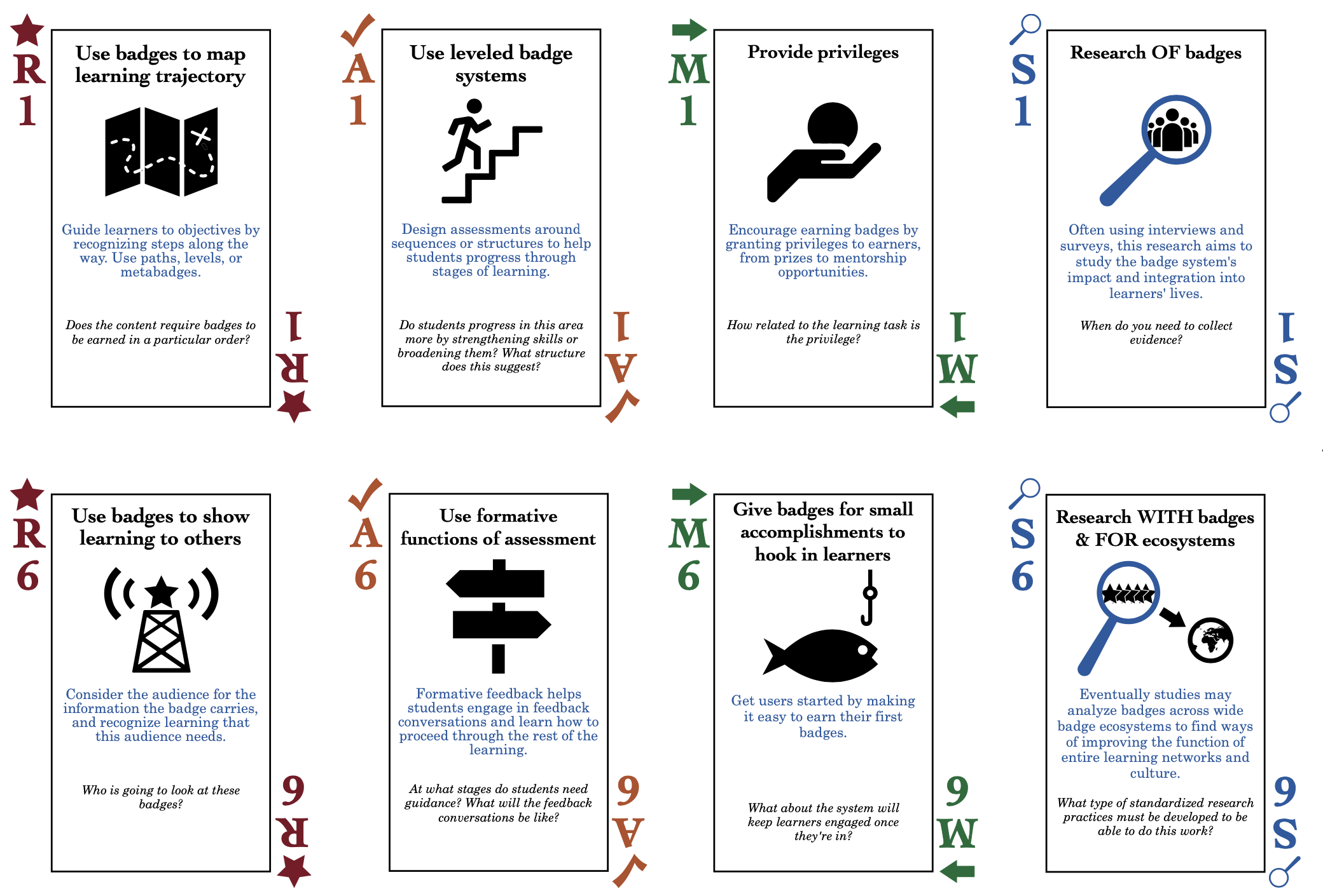 Hier delen we een set kaarten met ideeën waarvoor je badges en badgesystemen kunt inzetten. Deze DPD-kaarten zijn gemaakt als onderdeel van het Design Principles Documentation Project. Het DPD Project bestudeerde 30 Open Badges-initiatieven van de 2012 DML Badges Competitie, ondersteund door de MacArthur Foundation. Ze hebben deze set kaarten gemaakt met meer dan 30 badge-doelen in 4 gebieden: