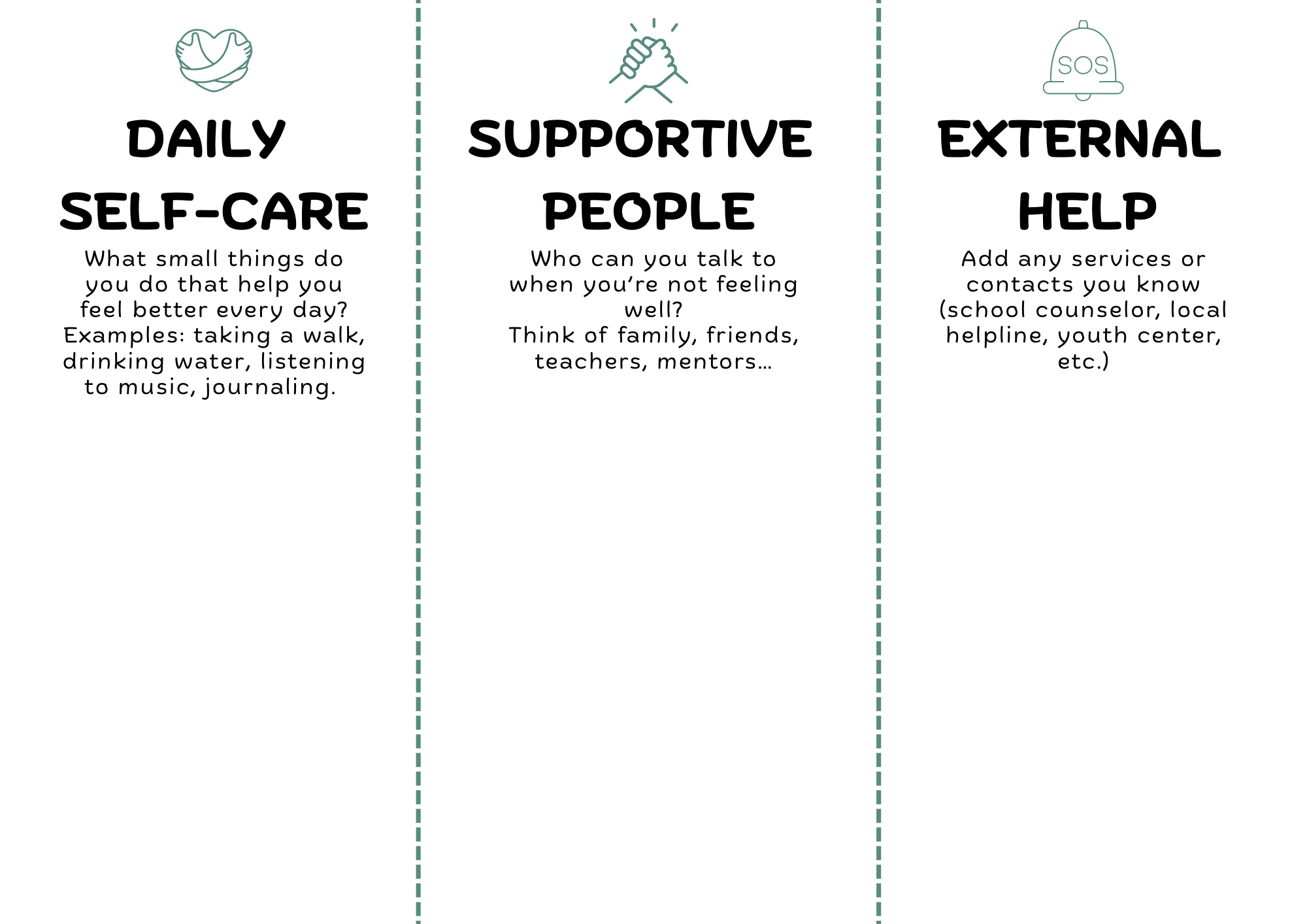 Let’s take a few minutes to create your personal wellness toolbox. This will help you understand what supports your wellbeing—and where to turn if you need help. Split your paper, and answer these 3 parts: